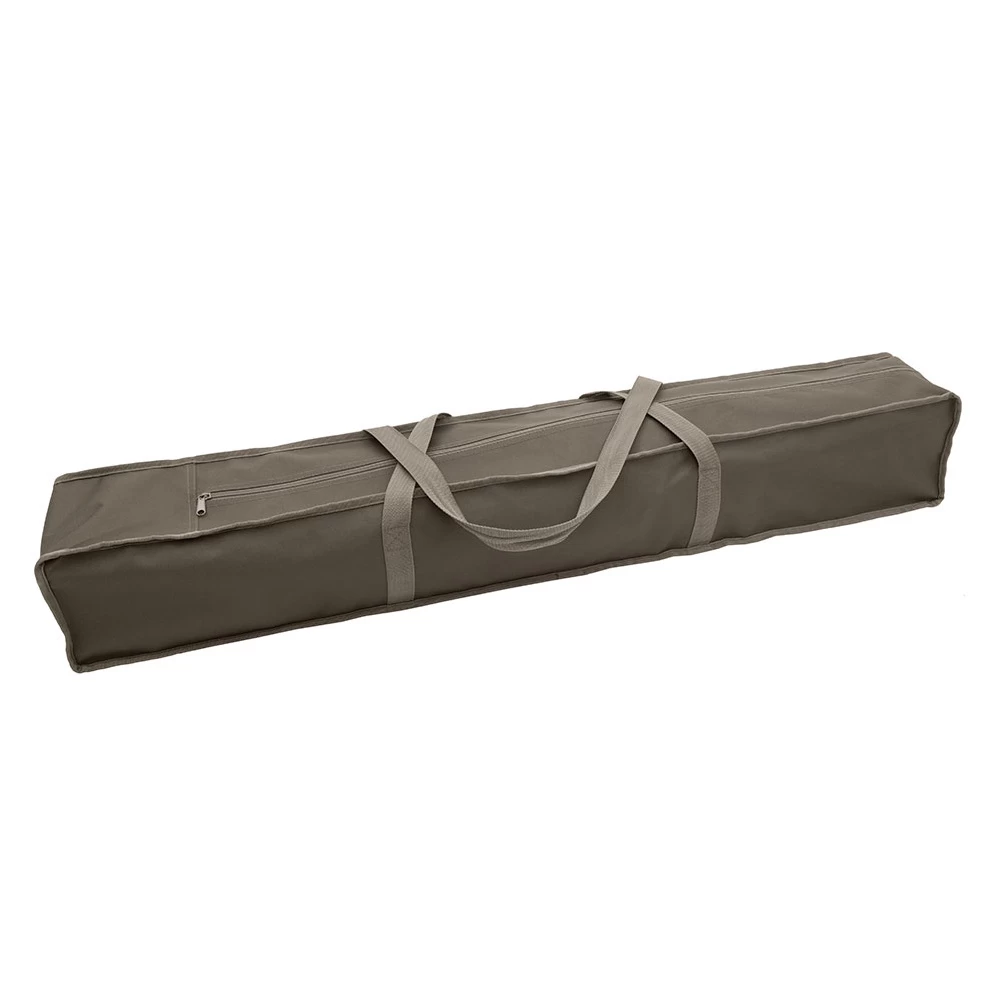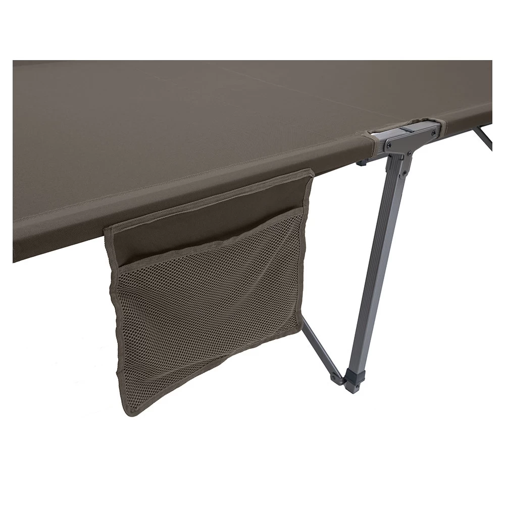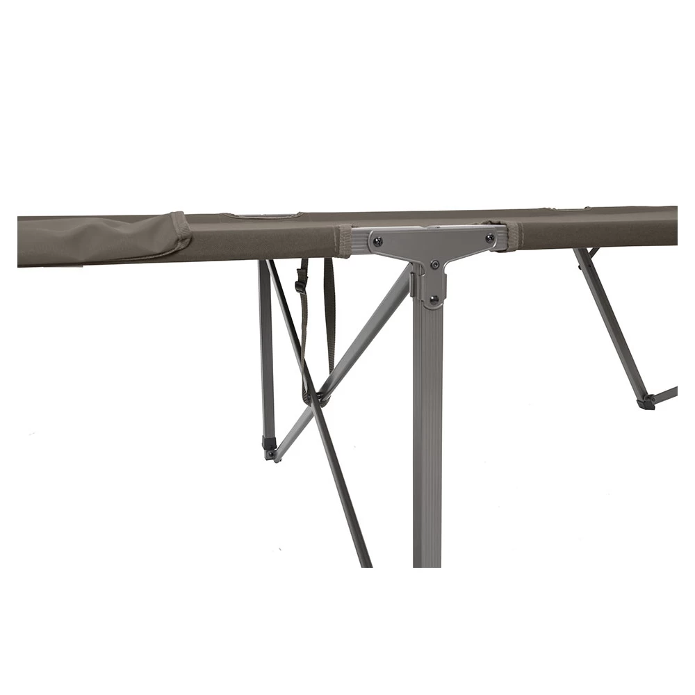 The Escalade Cot is a unique item because it sets up so quickly and easily… and taking it down is just as easy. The fabric and frame are all connected, so there’s no assembly required. Basically after you take it out of the included stuff sack, you unfold the cot and it “pops” open… and you’re ready for a good night’s sleep. Not having end bars to attach also ensures that your head won’t ever hit anything besides fabric. When you wake up in the morning, and are ready to pack it up, you simply turn the cot on its side, let it “collapse” and fold it up. It’s really that easy! The angled legs on the cot prevent it from rocking back and forth and the center support makes the cot rock solid.